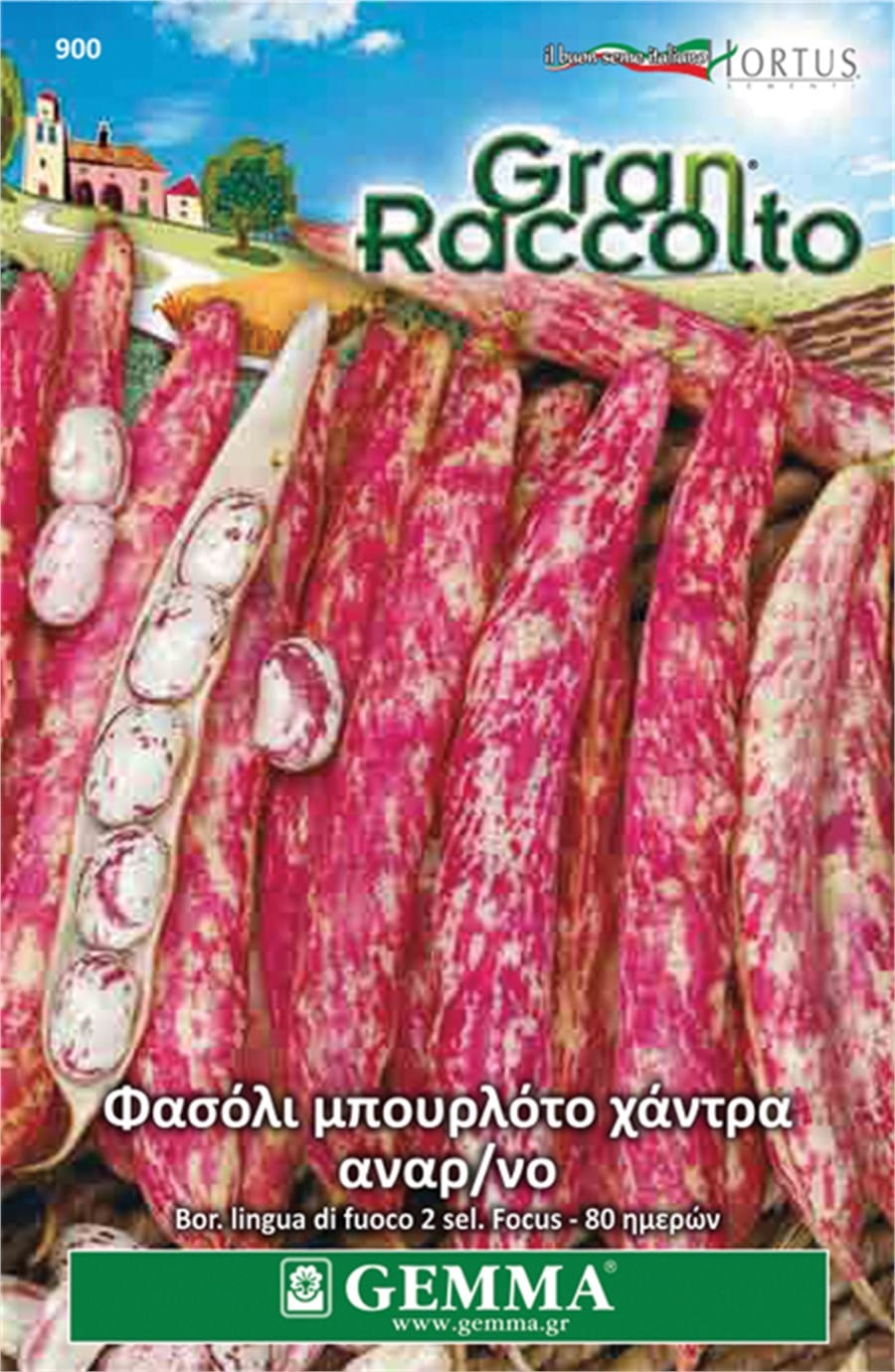 Φασόλι μπουρλότο αναρριχώμενο με λοβό κίτρινο-πρασινωπό με έντονες κόκκινες ραβδώσεις, μακρύ και ίσιο, περιέχει 6-7 καρπούς. Τα φασόλια διατίθενται σε φάκελο των 65 g.