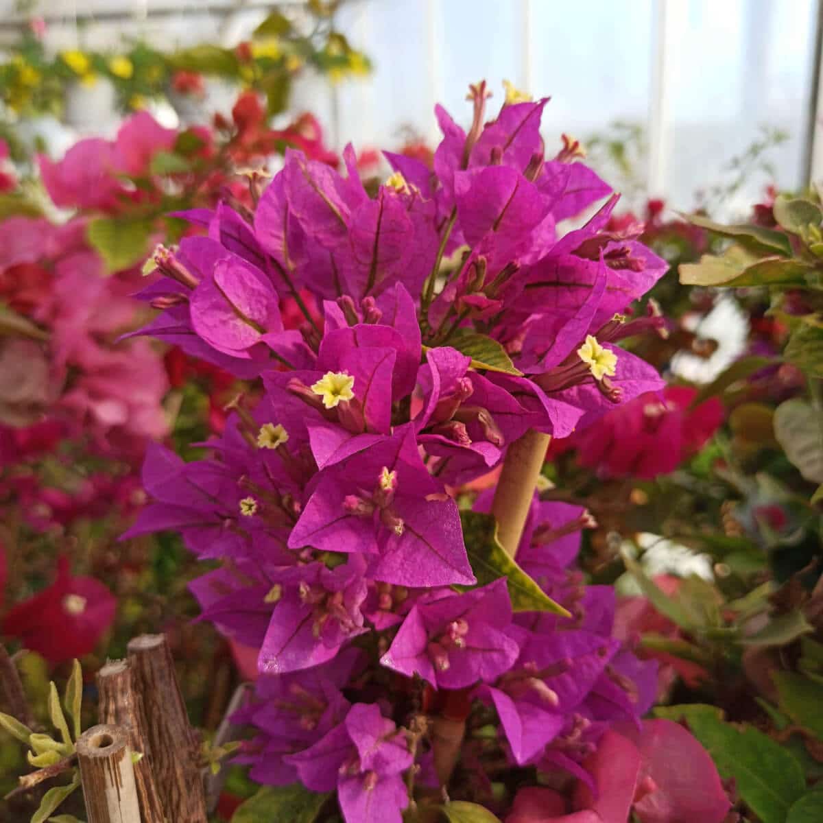 Αναρριχώμενο φυτό που μπορεί να φτάσει ακόμα και τα 10 μέτρα σε ύψος . Είναι φυλλοβόλα, αλλά σε περιοχές με πολύ ήπιο χειμώνα, διατηρεί μέρος του φυλλώματός της. Έχει αγκάθια που ποικίλουν στον αριθμό και το μέγεθος από ποικιλία σε ποικιλία. Ανθίζει πολύ ζωηρά σχεδόν όλη την θερμή περίοδο κατά κύματα. Τα λουλούδια που μας εντυπωσιάζουν, στην πραγματικότητα είναι βράκτια φύλλα που περικλείουν ανά 3 τα μικροσκοπικά λευκοκίτρινα πραγματικά άνθη της.